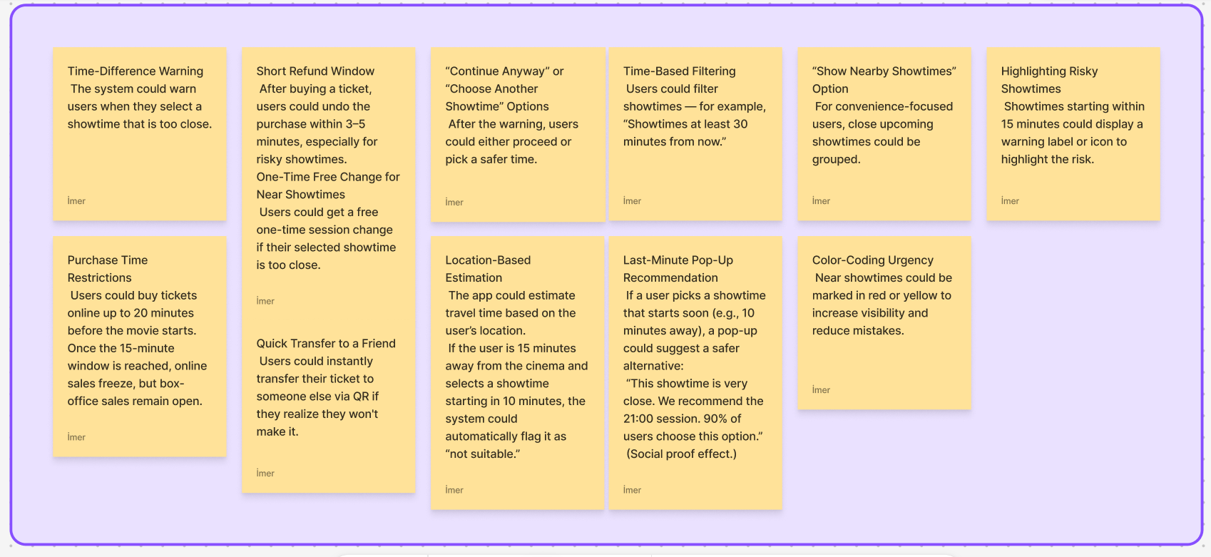 As I explored the flow, it became clear that the issue wasn’t just one wrong tap. It was a mix of unclear time cues, fast-checkout behavior, and the pressure people feel when making quick decisions online. Many users rely on habit and visual shortcuts—so when the system doesn’t highlight critical information (like “this show starts in 10 minutes”), mistakes become surprisingly easy. I mapped out these moments, looked at where misunderstandings happen, and used quick brainstorming sessions to explore how the experience could feel more supportive and less error-prone.